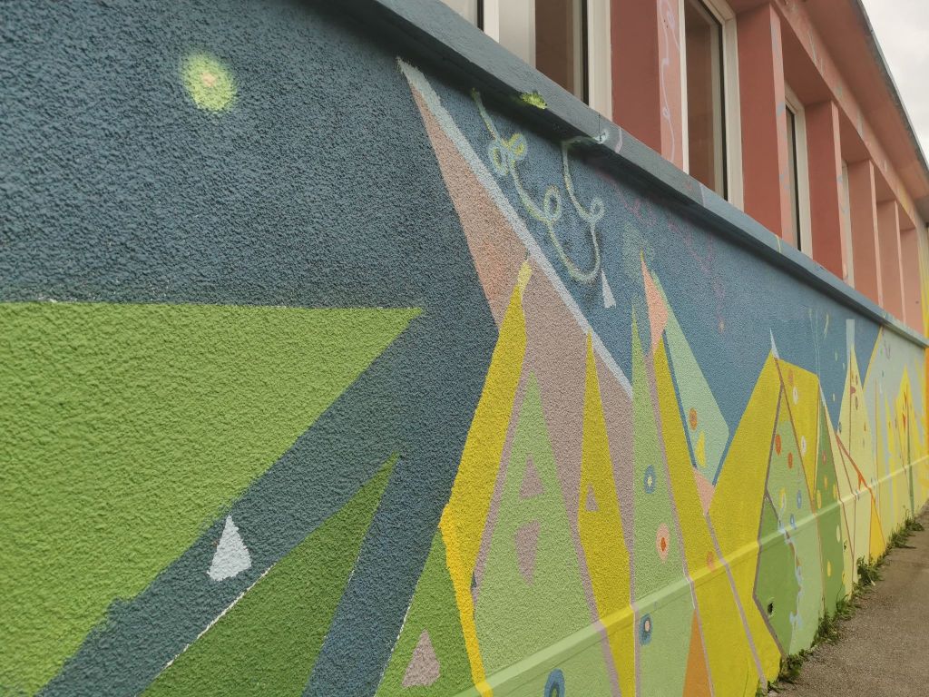« On peut dire que le tout ressemble à un enchevêtrement de formes et de couleurs, en tentant de se rattacher au thème choisi. Les ronds peuvent être des fleurs ou des insectes, les traits peuvent être des herbes ou des tiges ou tout simplement juste pour le mouvement en lui-même. Le bleu pourrait aussi faire penser à des fonds marins. Il faut laisser libre cours à son imagination en regardant cette fresque. Le choix a été de faire un mixte entre l’abstraction géométrique avec des formes bien définies et l’expressionisme abstrait avec des projections et des formes en mouvement n’existant que pour elles-mêmes. Les symboles sont également nombreux avec la nature, le soleil, l’herbe, l’infiniment petit et l’infiniment grand, les planètes, le mouvement, en définitive LA VIE ! Nous ne sommes par exemple pas sur la représentation exacte d’un soleil mais le soleil peint à notre manière. »