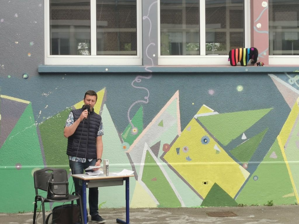Puis le spectacle a laissé place à un discours de l’un des professeurs de l’école afin d’expliquer le but de ce projet éducatif et à un autre discours de la part d’Aurélien Farlet, l’artiste qui a réalisé ce projet d’envergure avec les élèves. Le projet s’est déroulé sur plusieurs semaines, ce sont donc plusieurs heures de travail que ce soit pour l’artiste et pour les élèves.
