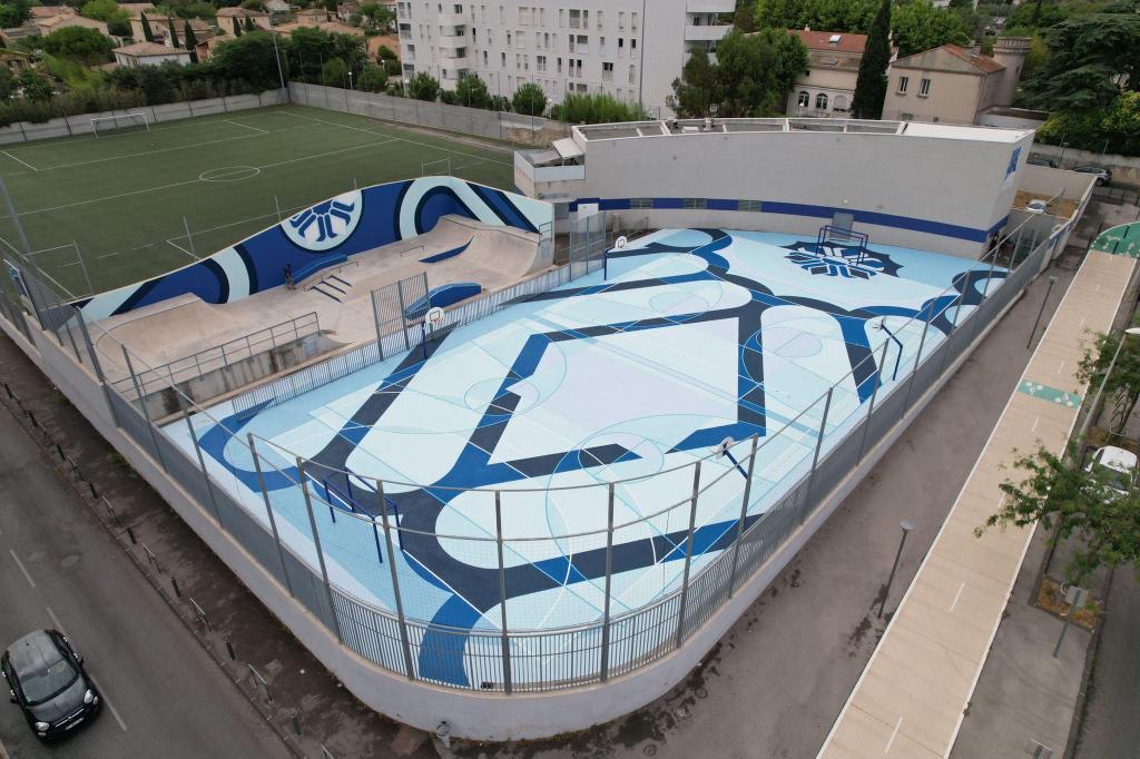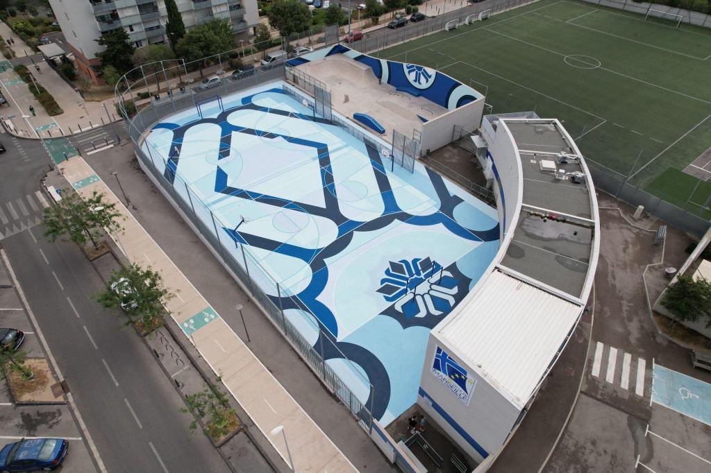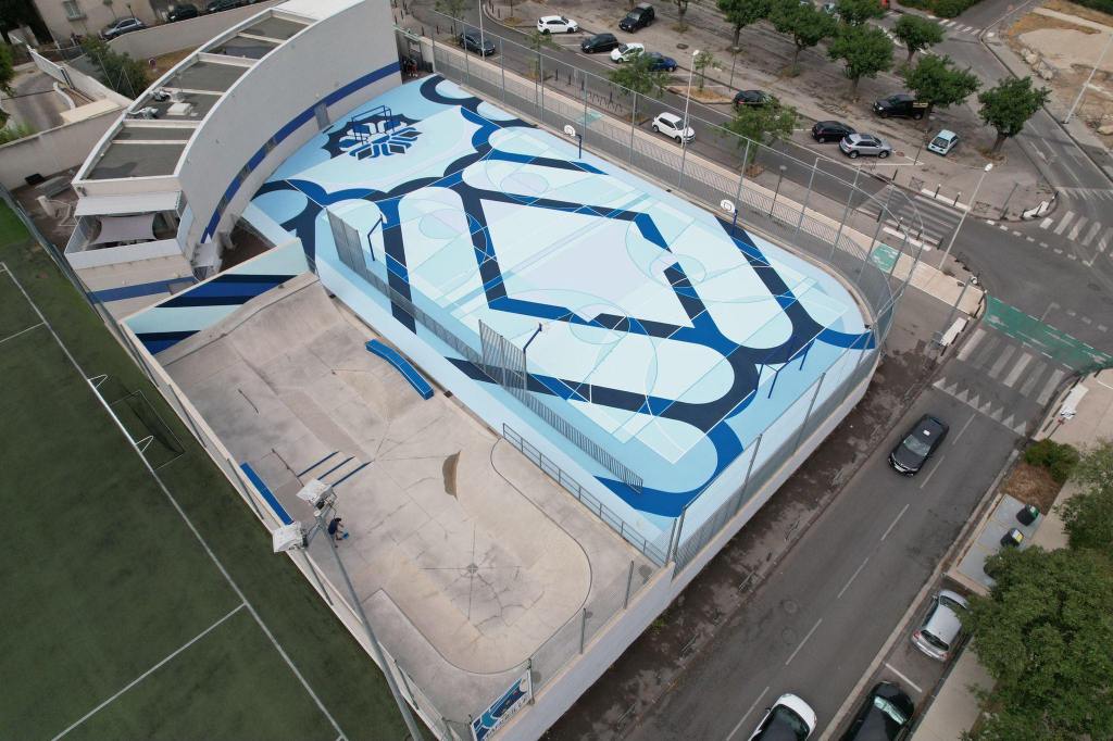 Les nuances de bleu s’assemblent harmonieusement sur les terrains du complexe sportif Ernest Rouvier, dans le 9e arrondissement. La fresque « Notoç » se distingue par ses couleurs au milieu des habitations du quartier de la Soude.