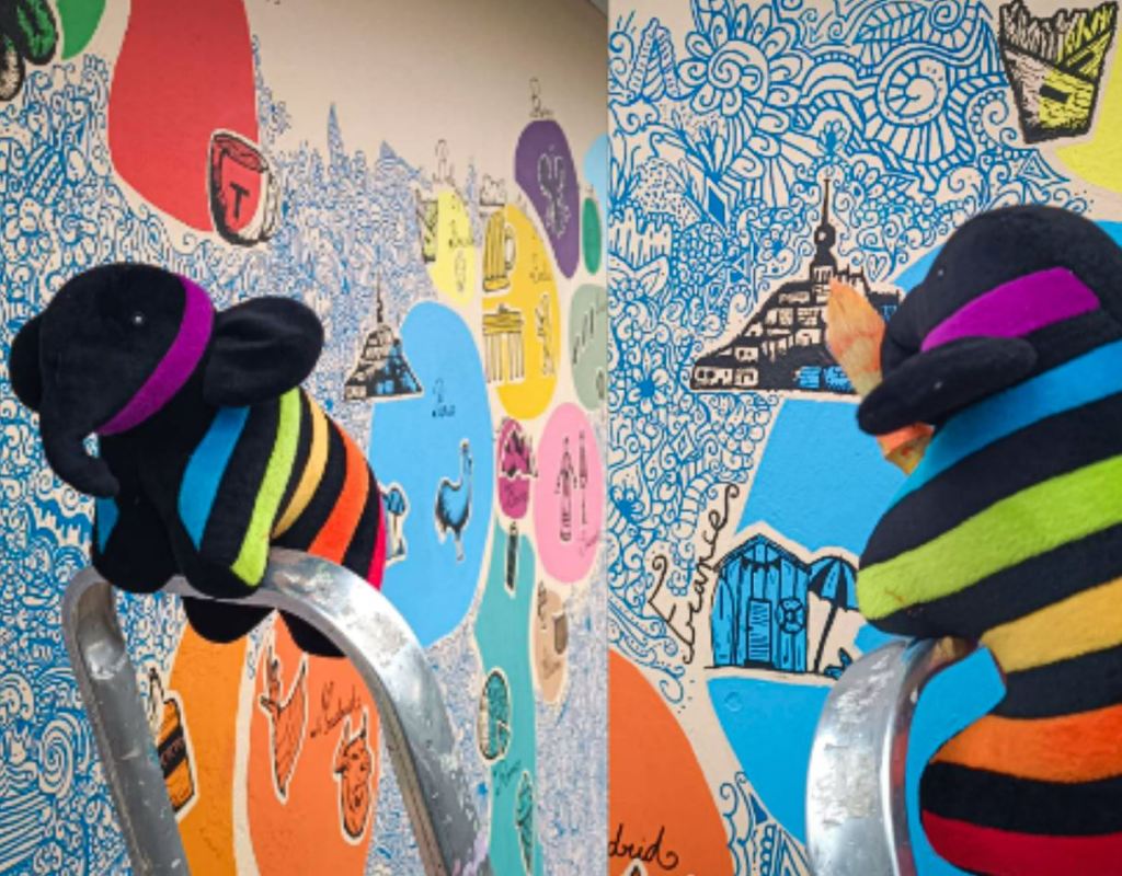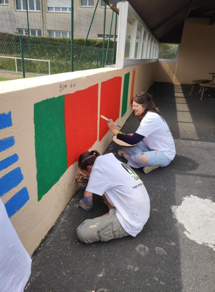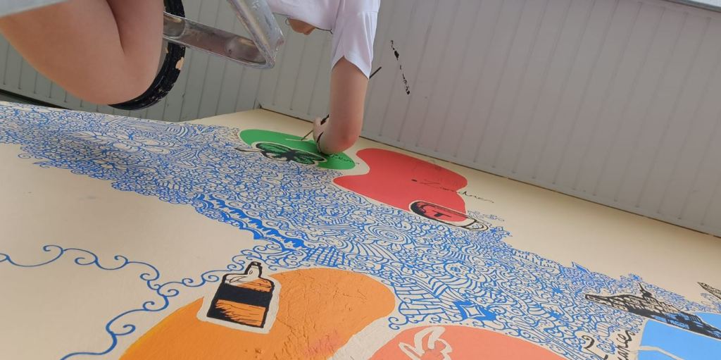 Sur cette fresque, nous pouvons distinguer les différents pays européens représentés par des formes géométriques de couleurs différentes. Le fond de cette fresque ainsi que les formes ont été réalisées avec les peintures Caparol, ensuite, des motifs en feutre POSCA sont venus l’agrémenter.