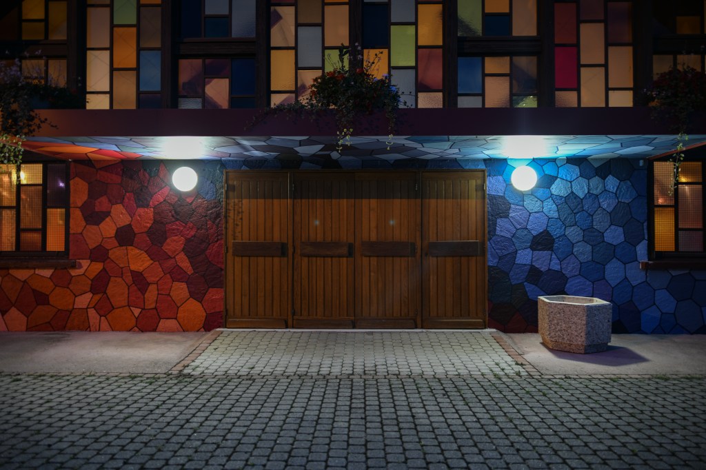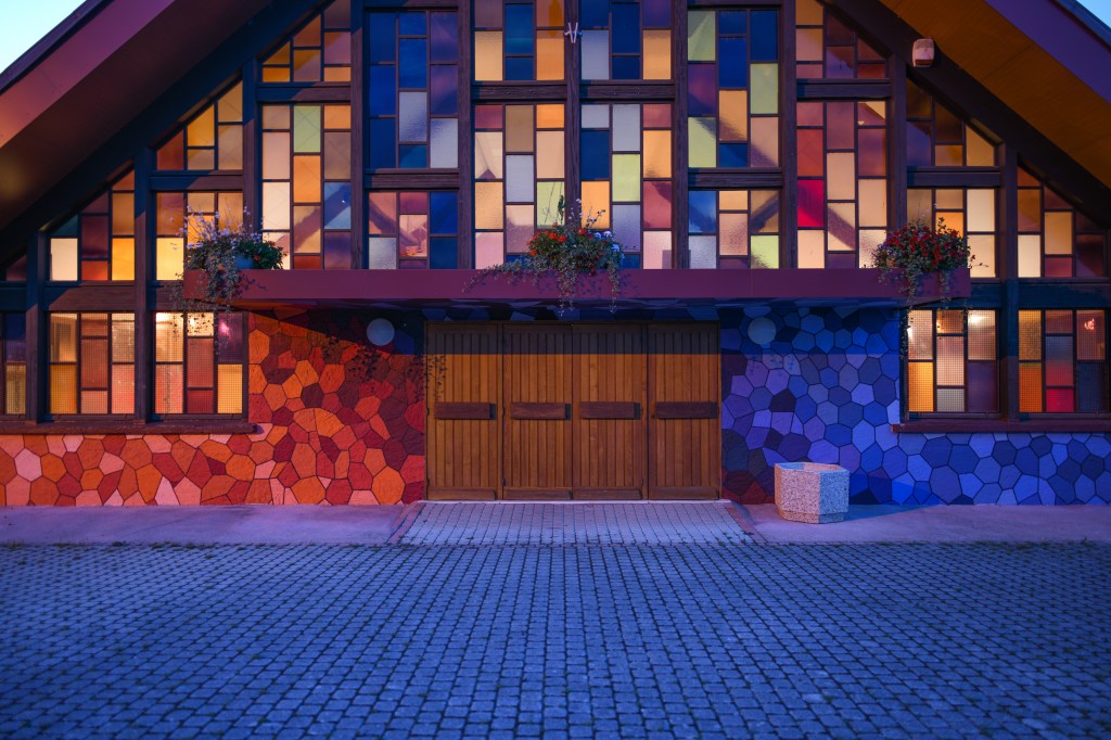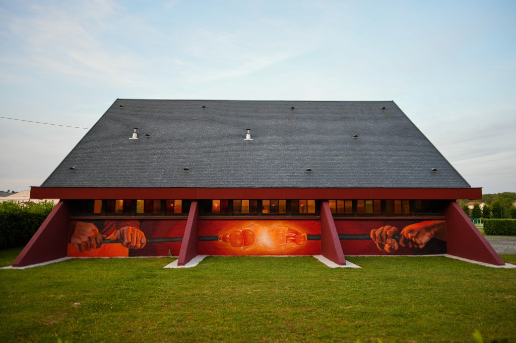 L’artiste Arnaud Katset nous a confié vouloir réaliser une fresque autour du mouvement, d’une part à travers la représentation des mains des verriers et leur gestuelle singulière, d’autre part, en peignant le verre en fusion qui s’étire et se déforme au gré du souffle et des manipulations. A l’image des nombreux vitraux qui composent l’édifice il a imaginé en toile de fond un dégradé aux multiples facettes.