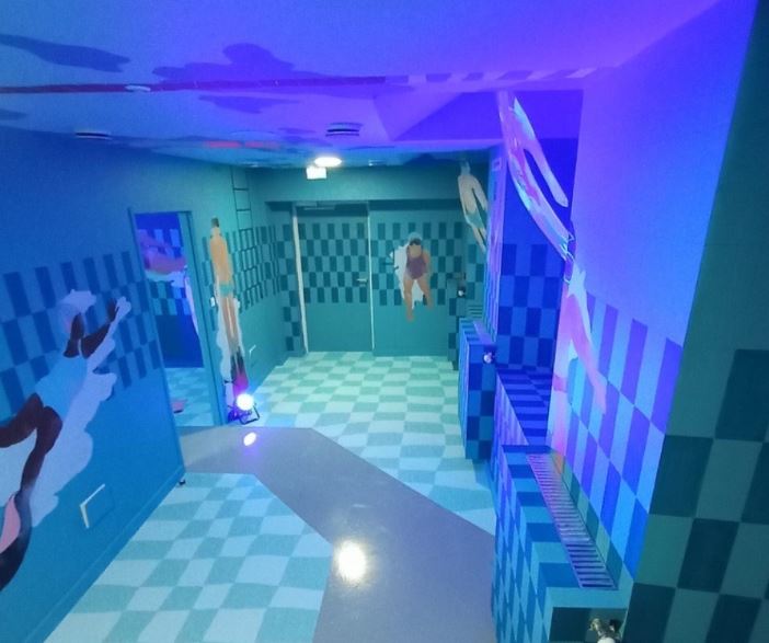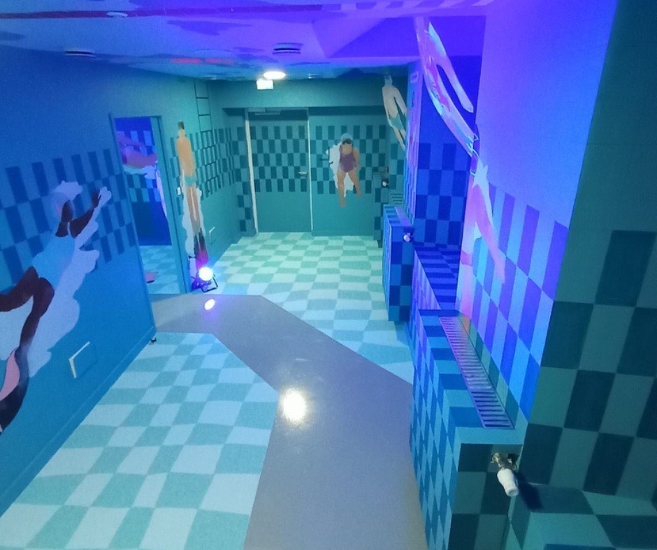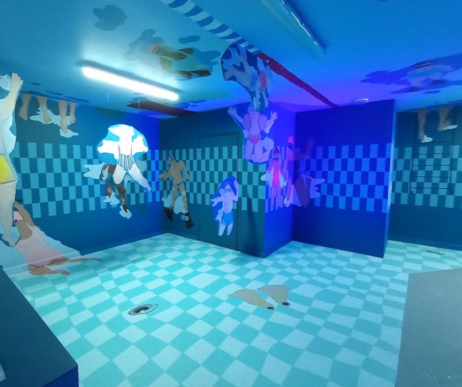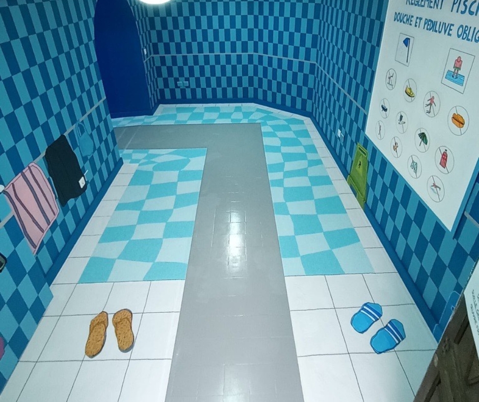 L’idée était de créer une piscine en peinture, directement sur les murs, dans un espace de 80m², des sols aux plafonds. Et donner l’illusion d’être dans un univers aquatique, sous l’eau ! Pour renforcer l’aspect immersif, la création en peinture a été couplée à une immersion olfactive et sonore.