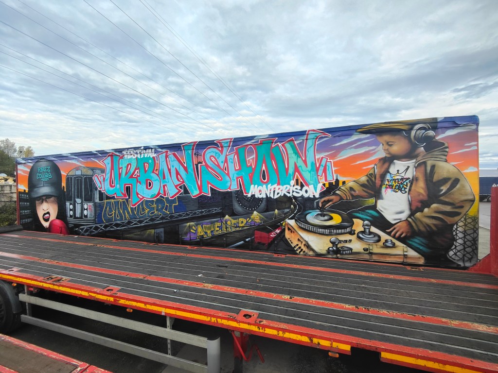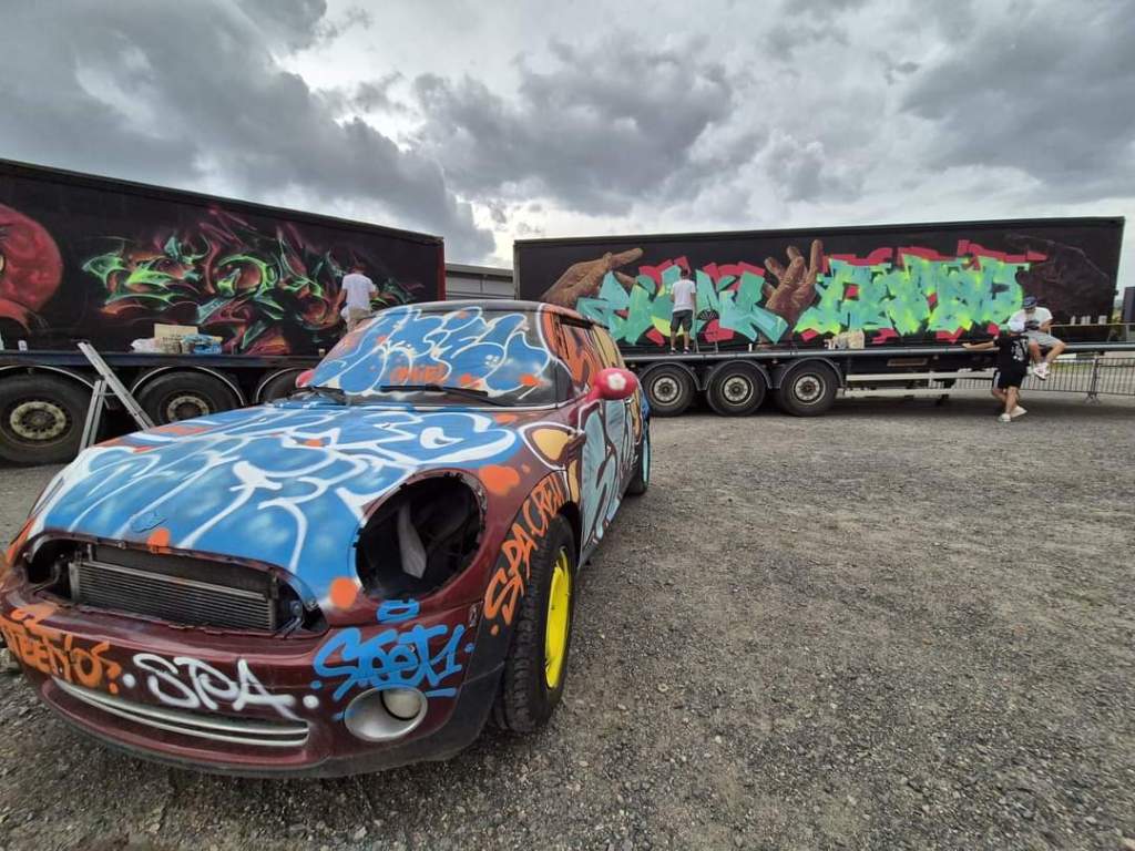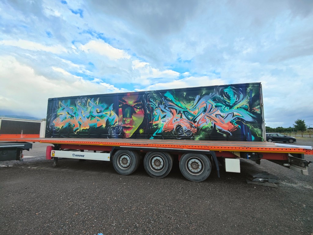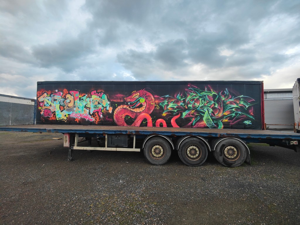 Nous avons été sollicités il y a plusieurs mois maintenant pour ce festival hors du commun. En effet comme évoqué ci-dessus le graffiti fait partie des disciplines mises en avant durant le festival. Mais l’originalité réside dans le support utilisé, en effet, ce sont des bâches de camion qui servent de support pour que les graffeurs puissent exprimer leur art. Les artistes avaient besoin de peinture pour réaliser l’ensemble des fonds des bâches de camion en noir. Ces supports ont ensuite été personnalisés à la bombe de peinture.