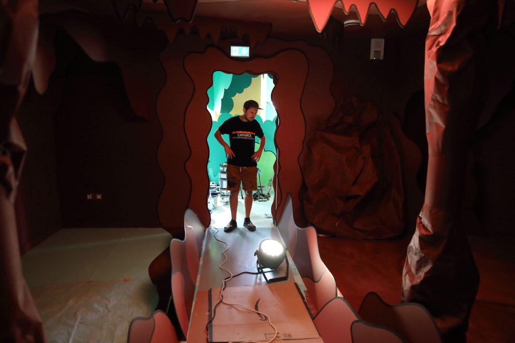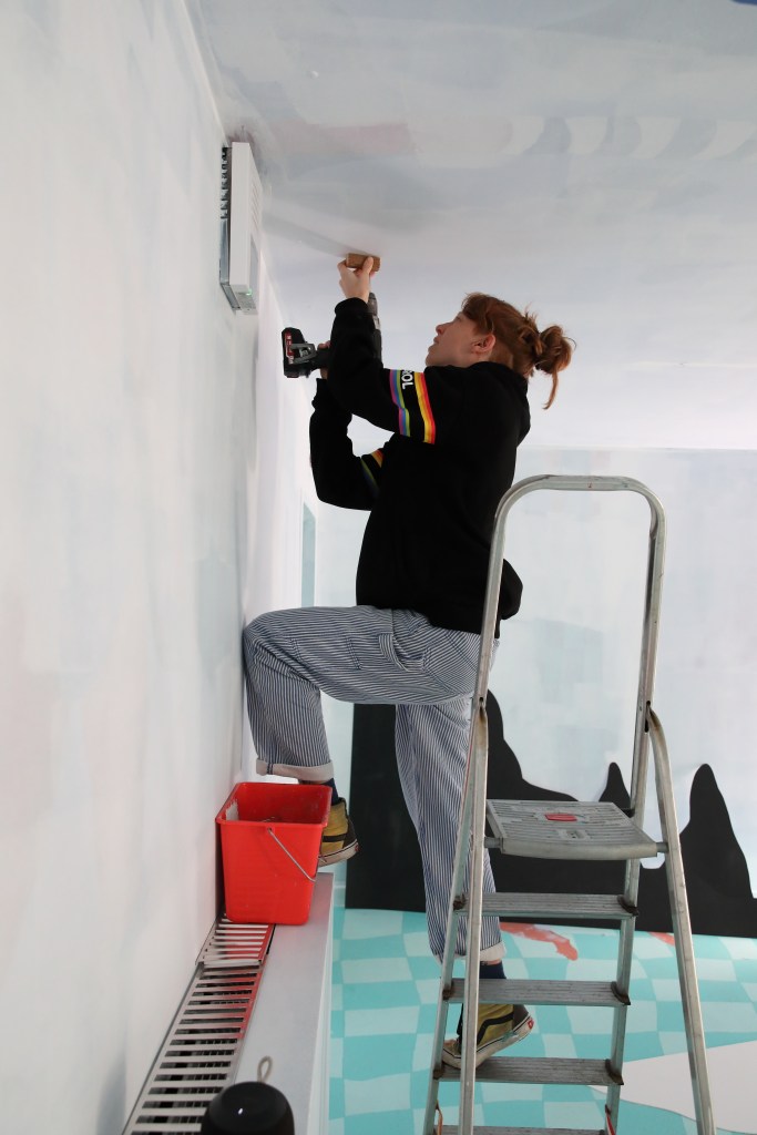 « On a réalisé trois pièces immersives pendant un mois de résidence dans la Drôme à l’Artsolite. Nous avons créé une scénographie sur le thème des grottes. Le visiteur entrait à travers une sorte de jungle puis continuait dans une grotte bien rocheuse dans les nuances de marrons avec stalactites et stalagmites et enfin une dernière pièce abritant également une sorte grotte de diamant mais plutôt dans les tons de vert. Nous avons choisi un large panel de nuances suivant chaque ambiance et univers que nous souhaitions représenter. Nous avons travaillé les peintures Amphibolin de Caparol au pinceau, au rouleau et même au pistolet. C’est très agréable de pouvoir directement utiliser les peintures Caparol tel quel sans devoir les retravailler et d’avoir les quantités suffisantes utiles. Les teintes, l’application et les échanges que nous pouvons avoir avec Caparol nous offrent une qualité de travail incomparable. Grâce à ce partenariat nous avons pu aller au bout de ce projet incroyable et de cette opportunité. » Les Toki